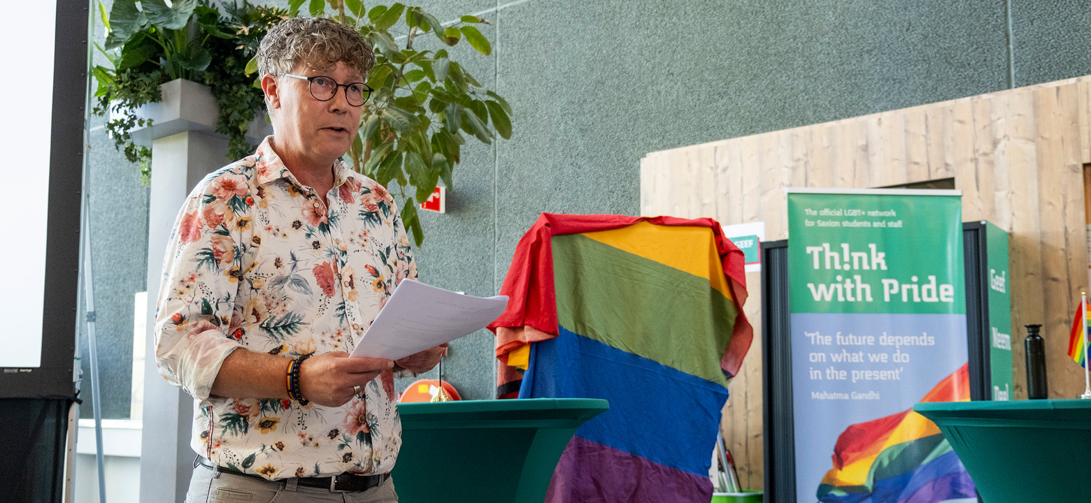 Voor diversiteit en inclusie moet constant aandacht zijn, vindt docent en Th!nk with Pride-ambassadeur Marco Strijks. Met de onthulling van een fonkelnieuw Pride-logo ging gisteren dan ook een langgekoesterde wens in vervulling. De Iraanse ICT-student Din Soleymani voelt zich gesteund door het logo. “Waar ik opgroeide is queer zijn reden voor vervolging.”