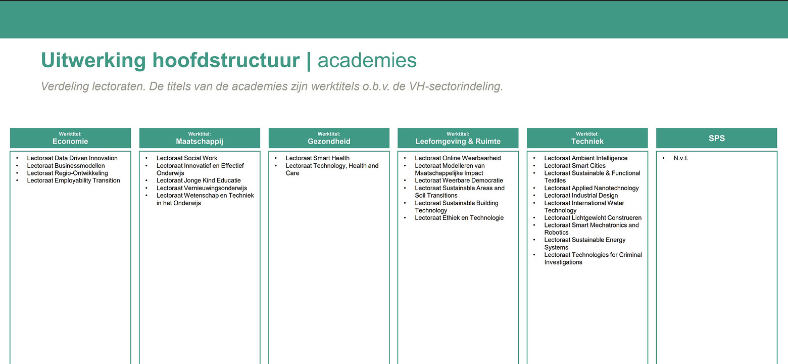 In een uitgebreide update op het intranet zet het college van bestuur de plannen voor de nieuwe inrichting uiteen. Tot dat voorstel kwam het CvB samen met de directeuren. In de update staat precies uiteen gezet onder welke nieuwe academie de huidige opleidingen en lectoraten gaan vallen, en onder welke diensten de huidige diensten gaan vallen.