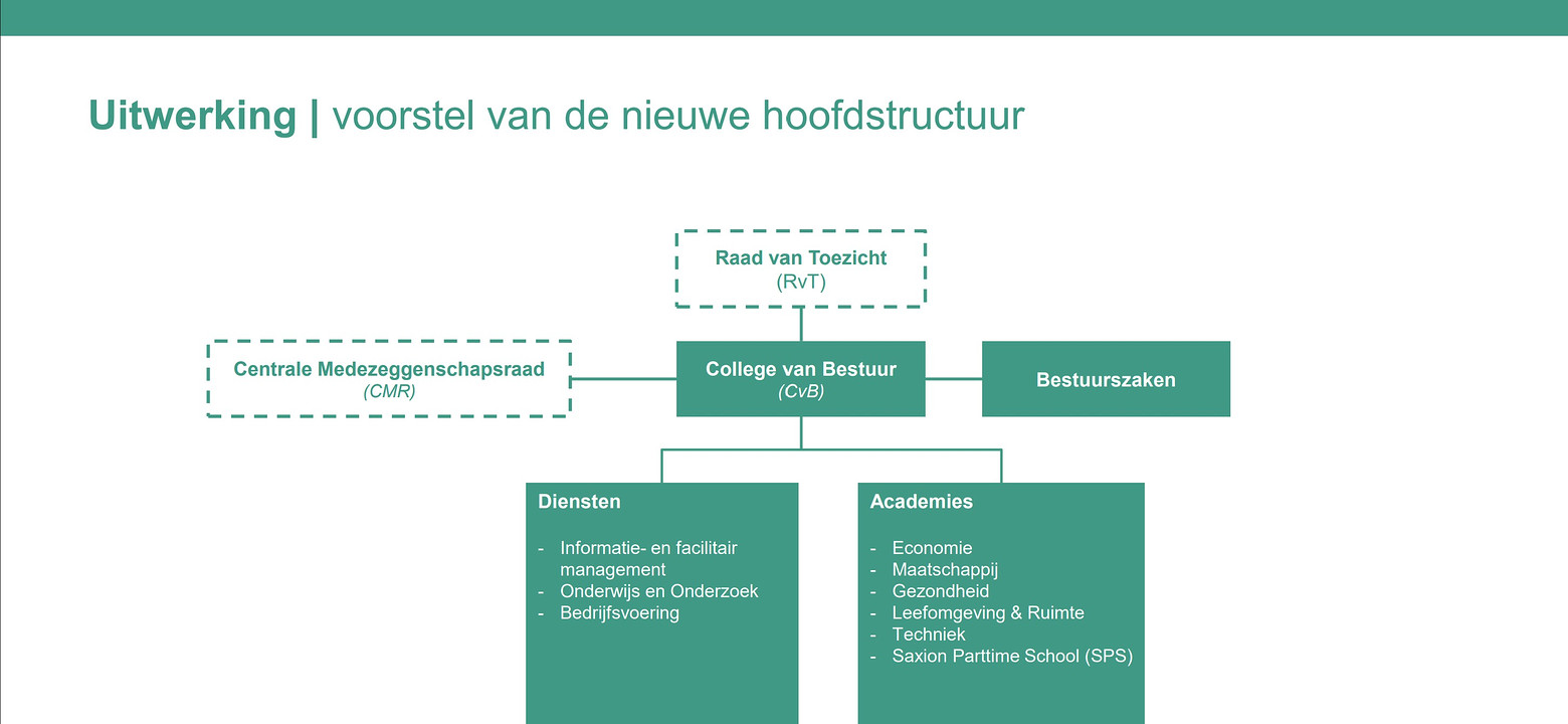 Het college van bestuur bracht vanmiddag naar buiten hoe het de nieuwe organisatie van de hogeschool voor zich ziet. Het bestuur wil de opleidingen onderbrengen in zes grote academies met als werktitels Economie, Maatschappij, Gezondheid, Leefomgeving & Ruimte en Techniek. De Parttime School blijft een eigen academie. Er komen drie ondersteunende diensten: Informatie- en Facilitair Management, Onderwijs en Onderzoek en Bedrijfsvoering.
