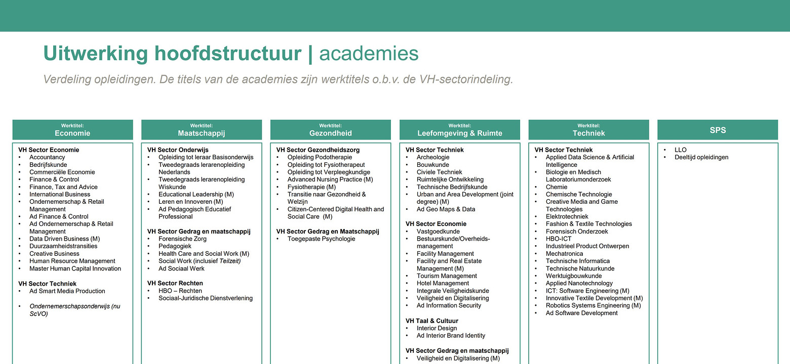 Een paar voorbeelden: de lerarenopleidingen (nu APO) vallen straks onder de academie (werktitel) Maatschappij, Accountancy onder de academie Economie (werktitel) en bijvoorbeeld Tourism Management en Civiele Techniek onder Leefomgeving & Ruimte (werktitel).