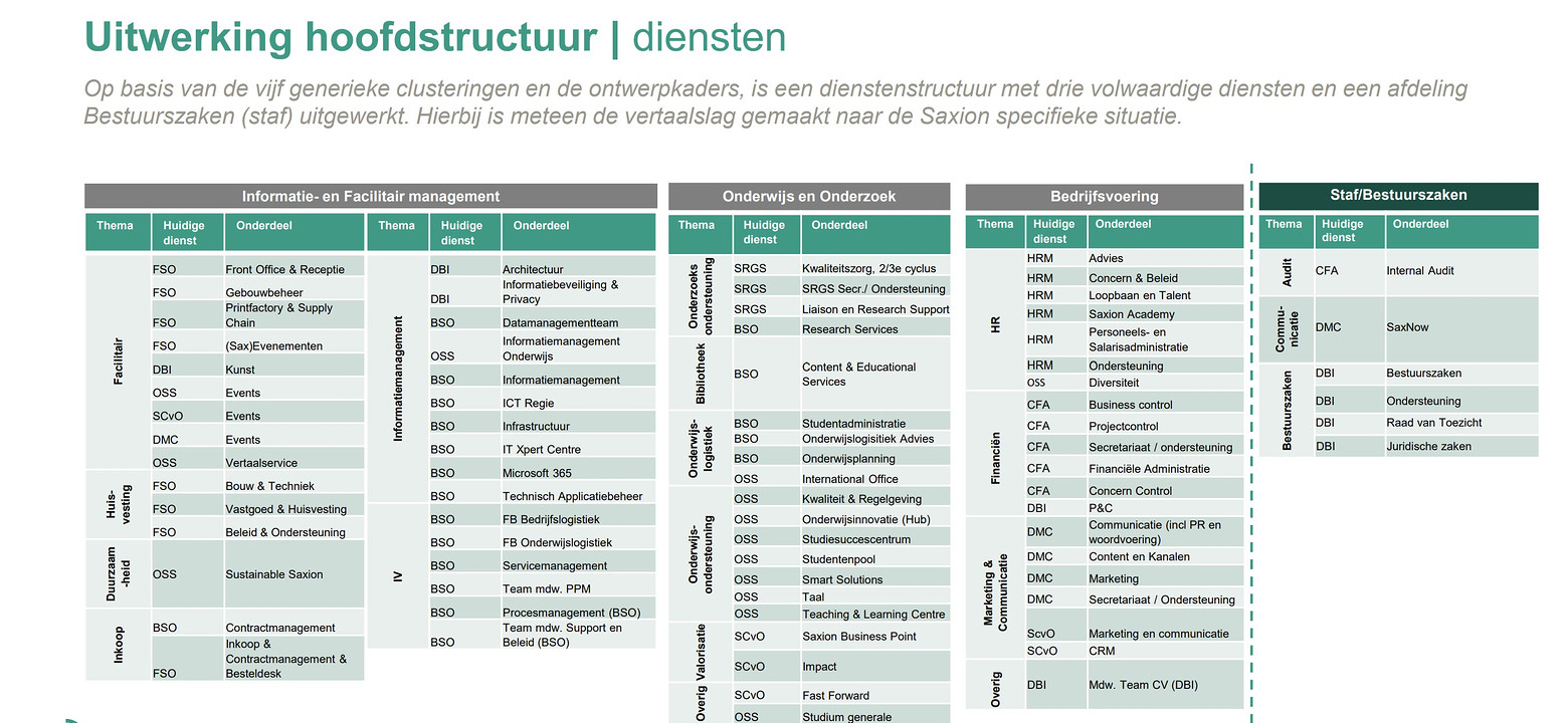 In het voorstel blijven de huidige diensten niet per se ‘intact’. De taken van de Business Service Organisatie (BSO) worden verdeeld over de drie nieuwe diensten en het Centrum voor Ondernemerschap (SCvO) gaat naar een academie. Naast de drie diensten komt nog een aparte tak Bestuurszaken. Zie voor de voorgestelde nieuwe indeling van de diensten onderstaande afbeelding.