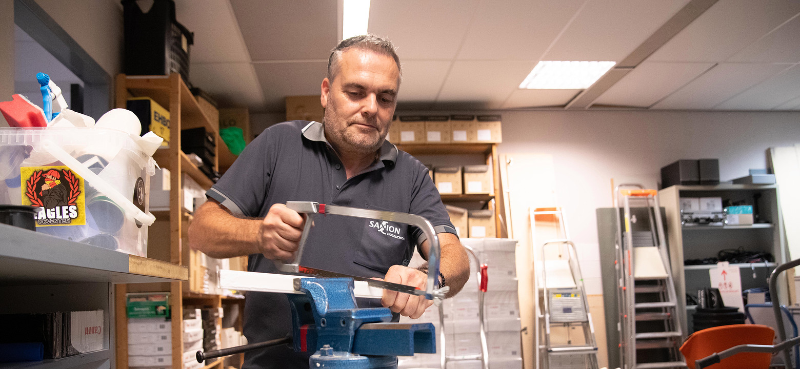 “Ik dacht altijd: waarom zou je dat doen? Heel je leven op éen plek. Ik heb lang in de service en techniek gezeten, deed onderhoud aan bijvoorbeeld koffiemachines en snijmachines bij supermarkten. Leuk werk, met veel vrijheid, ik trok er het hele land voor door. Maar uiteindelijk werd de tak van het bedrijf waar ik werkte overgenomen door een ander bedrijf. We kwamen er niet uit en ik wilde me niet laten piepelen. Dus ging ik opnieuw op zoek. Toen kwam mijn vrouw een advertentie van Saxion tegen. En ergens dacht ik toch: waarom niet? Op je fietsje naar je werk in je eigen stad, hoe fijn is dat? Ik moest qua salaris wel wat inleveren, maar dat gaf niet de doorslag.”